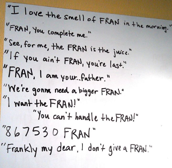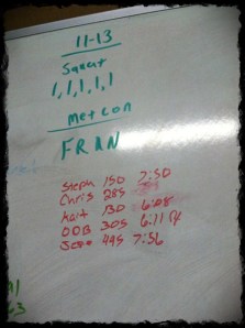 1. I did Fran for the first time this week. Brutal. My time was just over 11:00. That was with the weight scaled down too. Lamesauce. I’ve only been doing CrossFit for 6 months so I suppose there’s plenty of room for improvement.