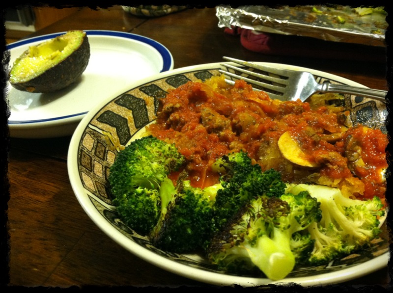 Pulled Pork ended up being FABULOUS. My lunch yesterday made me a happy camper! For dinner I went with my old fallback of Spaghetti Squash and Pasta Sauce with GrassFed Ground Beef! This time around, since my squash had been sitting in fridge, I sauteed the squash in GHEE with some garlic and shallots. This was very nice flavor profile when combined with the meat sauce. Added some roasted broccoli to the mix and dinner is served! I did end up eating some fruit after all, 6 cherries.
