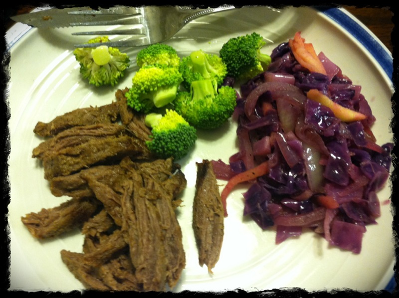 For dinner, I overcooked some skirt steak, FAIL. Overcooked to my standards but still good to eat. I then took a recipe from NOM NOM PALEO for red cabbage. This is now my second time to eat/cook cabbage (other than in salad mixes) and it was good. And the red cabbage looks so pretty. PURPLE of course. And if you don’t know, purple is one of my fave colors. So much that I have purple glasess, purple water bottles and purple hair. Enough of my purple love. Cause I love green and blues too! In addition to the red cabbage and the skirt steak, I had some raw broccoli. I was going to cook it but ran out of UMPH to do so.  Overall dinner was a success. While I was cooking dinner, I made some more chicken soup for my lunch today. Pretty productive last night!