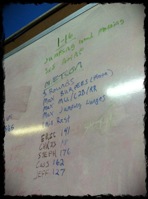 MetCon: 3 Rounds of 1 minute of Burpees to Plate, MuscleUps/ChestToBar/RingRows, Jumping Lunges, Rest