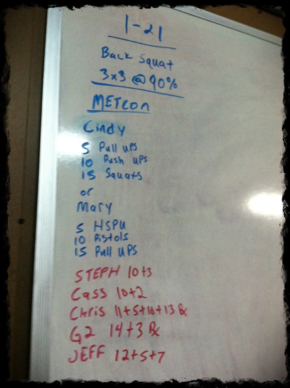 Ah Cindy, I do not like you. I’ve told you this before. My feelings have not changed. Something as simple as Pull Ups, Push Ups and Air Squats can be soooo evil! Especially when it’s a 20 minute AMRAP. Cindy I know I’ve done. I have one blogged record and although it was a lower score at 6 rounds 4 rep, I was only using one green band. Today I was using one green and one blue band. :/ I suck so bad at Pull Ups. I managed to get through 10 rounds 3 reps. I’m a baby. Cindy is Mean. The End.
