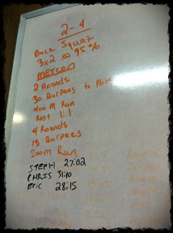 I bet you were wondering where NO MORE BURPEES came from and well now you know. Burpees last Saturday, Burpees this recent Saturday and Burpees this morning! And of course I’ve set a precedent that I can bust out burpees. This is a curse people, A CURSE! I can’t not do burpees well anymore. It’s a badge that I was proud of but I’m good now! I don’t need it anymore! So I didn’t even look at the clock to see how fast or SLOW I did the 30 burpees but I got back from the run in 4 minutes flat. So I got to rest for 4 minutes. Rinse and Repeat. I did the second round in 4:12. Woo I get an extra 12 seconds of rest! Not the goal I know but hey it’s 12 seconds. Then it was the 4 rounds with NO REST. Since most of you know I suck at running I wasn’t sure how it would all go down. I did my first round like a champ! Rounds 2, 3 and 4 a little hard! I got back from the first run and just went and knocked out 7 burpees, tried not to vomit then finished. After run 2 I only busted out 5 burpees, then dragged ass. It was the same after run 3! By the 4th round I was ready to quit. I got to 12 and I heard someone say just move and I finished the last 3 as if I was fresh out of the gate. Ran as fast as I could which wasn’t much. I finished the 4 rounds in just over 10 minutes with a final time of 27:02. Not too bad I hope. I’ll have to wait to see how the rest of the day pans out via the whiteboard though!