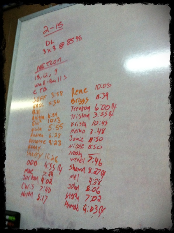 So I’m a little more flexible at the end of the day than I am at 5 am. So Wall Balls although brutal aren’t as bad on the hips in the P.M. My shoulders were not too happy with me in general but I got the job done better than I have been in the past. It’s the damn Pull Ups that still get me! Time 7:02
