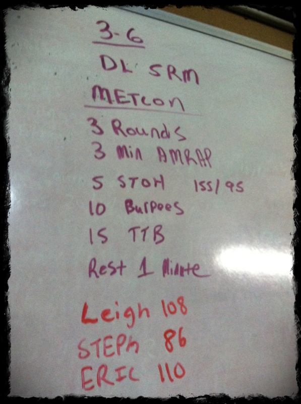 SOOOOOO being all sleepy and old feeling I forgot we had a 3RM day last week, so I was just going until I could go no more or until time ran out! After some good warm ups I was ready to jump up in weight and like I’ve been saying over and over, DEADLIFTS finally feel good to me. I used to dread them but now it’s like wow, I can lift this. My hamstrings aren’t wound up tighter than a (fill in the blank because I’m at a loss for something funny). I worked up to 185 and knocked those out. Coach said was that HARD. I was like NO but it’s not EASY either. So he goes it was easy. Do one more set and add weight. So I went up to 195lbs and besides losing grip, I felt good at this weight. Again not HARD but not easy. Just somewhere in the middle. I don’t do the math to find out what my 1 RM should be but it should be something amazing! Yay for Deadlifts!