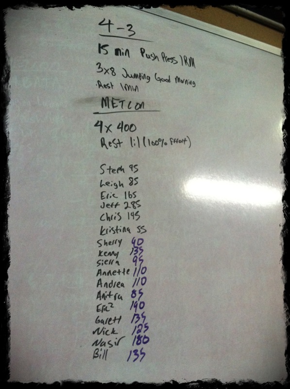 Skill/Strength: 15 minutes to find 1RM Push Press and 3 X 8 Jumping Good Mornings.