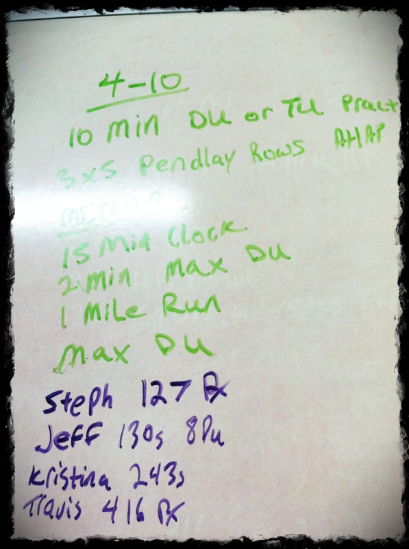 MetCon: 15 minutes of – 2 minutes MAX Double Unders, 1 mile run, MAX DU’s with left over time.