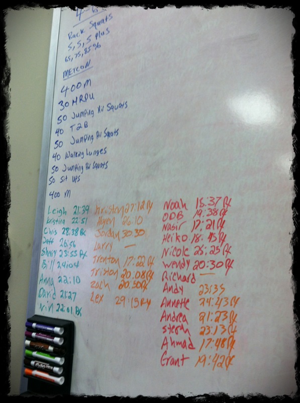 Last week was the week for some longer workouts and they were a beating. Wednesday was no different. We didn’t even have a Skill/Strength. We went straight to the WOD after warming up.
