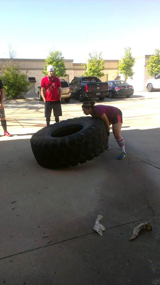 There was a 300lb tire already living in the vicinity outside the box so we took the opportunity to work on proper technique to lift the tire. Low and behold we even got pics and video. Thank you Annette!