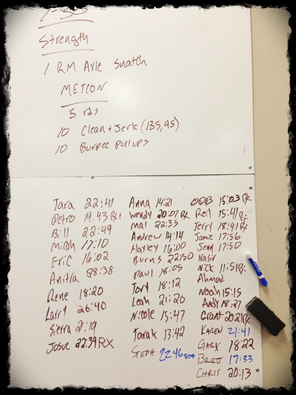 MetCon: 5 Rounds 10 Clean & Jerks (135,95) 10 Burpee Pull Ups