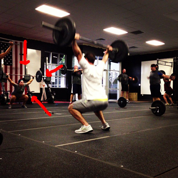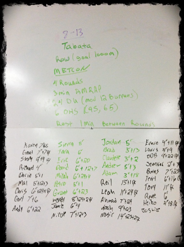 FOUR – 3 minute AMRAPS. I wasn’t sure how that was going to play out. 3 minutes isn’t a long time but it’s long enough to get work in. I just wasn’t sure where I would fall in. I was determined to go RX on Overhead Sqauts. The weight wasn’t super heavy but I figured between that and DUs my shoulders were going to fade fast. Plus Coach wanted us to do the OHS UNBROKEN so I had to will myself to stay strong. And it worked. After each set of DUs, I took a little bit of a pause so I could catch my breath, then I’d get right to it. I wasn’t popping up and down like an Elite athlete but I was getting the work done. Slow and steady. It felt like all of my first reps were wonky but once I got set, the rest of the reps were more stable. I had a mean face on. See pic below. I’m just in the background but it’s a look of determination and focus.