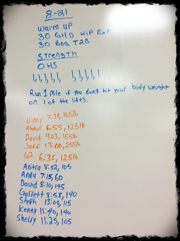 With time, they are more of my friend. My wrists aren’t so puny anymore and although any large amount of OHS work will still cause some pain and havoc, I am much better. Knowing that I’m heavier, I know that I will be able to move more weight. I just wasn’t sure how MUCH more weight. So I set myself up for my 1RM of 90lbs to be my 5th attempt. Just in case I wasn’t that much stronger! Looking back, I wish I had made that my 2nd or 3rd attempt. I also wish we had more time to get the 10 reps in. I only made it to my 9th attempt before time ran out. If I didn’t have a J-O-B to get to, I would have definitely tried for the 10th attempt. But nooo I had to run that mile. So anyways, when going for a heavy 1 rep, one does not simply just make big jumps in weight. There’s a process… mental and physical. But sometimes that process needs to be pushed aside. Should have, would have, could have … I know. I just wished I had gone bigger. I had my 10th attempt set for 115lbs. Time was up at the 9th attempt. So I jumped right in and did 115 like it was a piece of cake! UGH I wish I had more time. I’m thinking at least 130, AT LEAST! None the less, I will take a 25lb PR. Grant, if you’re reading this I finally rang the PR bell. I know I’ve been resistant to ringing it but I felt good with the OHS PR.