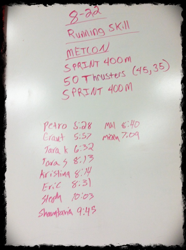 So it’s time for the MetCon: 400m run, 50 thrusters (35lbs), 400m run. Well I got thrusters at 35lbs. Not sure how I’ll feel after the first run, but it’s a light weight. I’ll be ok. And I was. Besides my calves wanting to explode off my legs. Not sure if Inov8s are hurting me or helping me at this point. But I get through my Thrusters 15, 10, 10, 7, 8 and back to running. I really tried to focus on all the things we just worked on but by the end I was just trotting along, walking, trotting. It was horrible. Time 10:03.