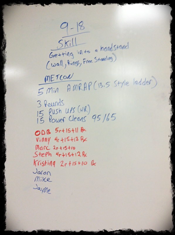 MetCon: 5 min AMRAP (13.5 style ladder) ā 3 rounds of 15 Push Ups (HR), 15 Power Cleans 95/65. Go up the ladder until you can no longer complete the rounds under the cap. 5 min=3 rounds; 10 min=6 rounds; 15 min=9 rounds; 20 min=12 rounds