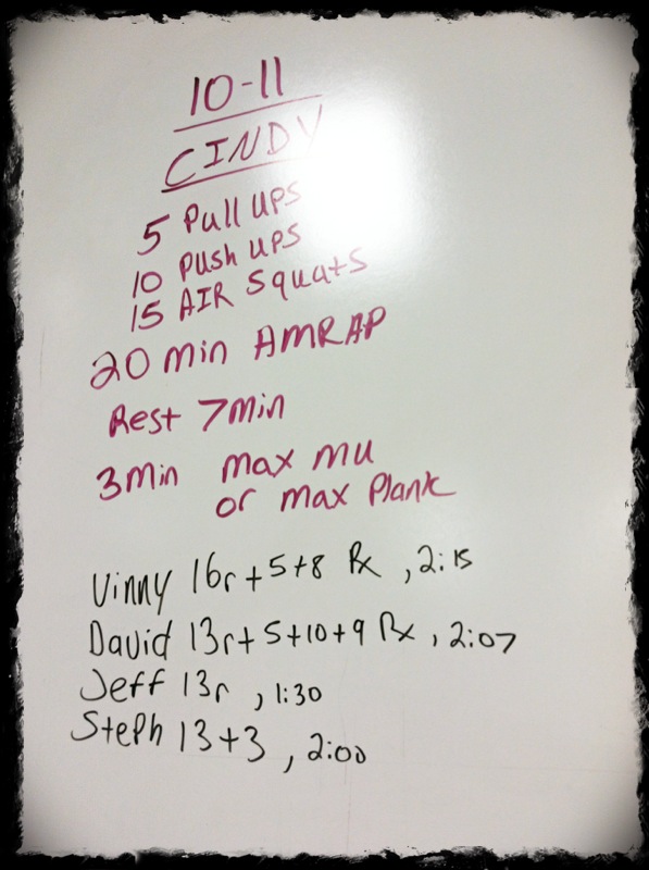 Banana Fana Fo Findy, Fe Fi Mo Mindy, Ciiiindy! It’s official, I have certified myself into dorkiness forever. But that was seriously in my head this morning. And guess why? CINDY! I love to hate this workout and hate to enjoy it. Let’s be clear there is no REAL LOVE for this dirty girl.