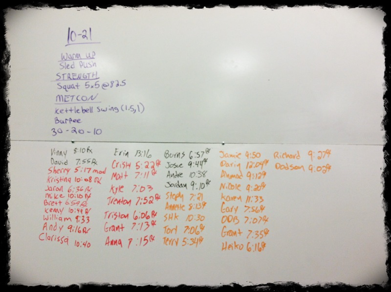 Since the KB was light, I was able to get through pretty easy. It was the Burpees that got me. After 15 in my first round, my knuckles were on fire. I thought I ripped. Looked down expecting to see torn skin, blood, etc. But they were just RED. I just had to fight through. Time: 7:21