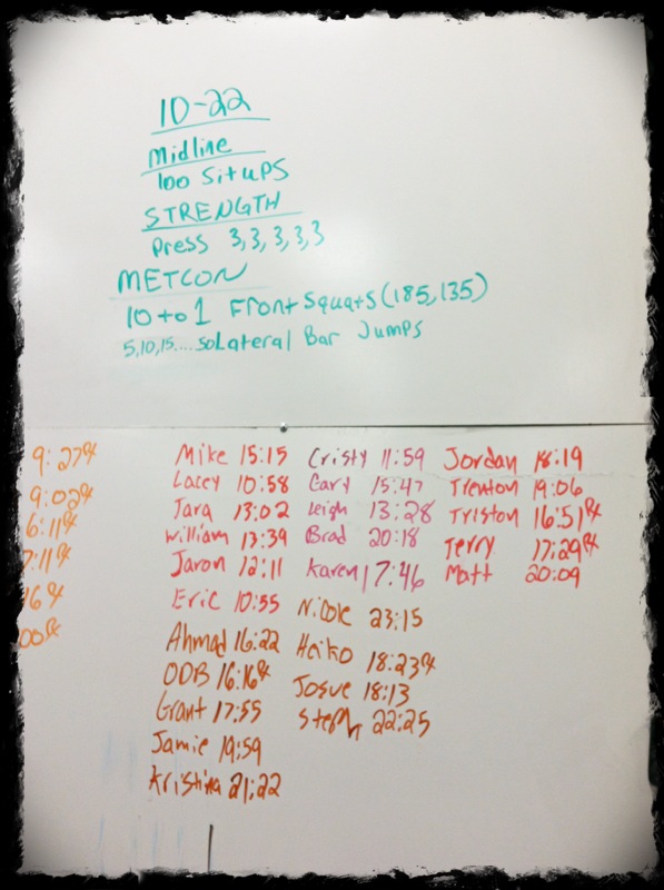 The killer part was the Lateral Bar Jumps. We had to do 10 Front Squats, then 5 Lateral Bar Jumps, 9 Front Squats, 10 Lateral Bar Jumps, etc. After the 30 lateral jump mark, I was just smoked. I’d do 5 at time, 10 at a time, etc. And the Squats got easier. Damn those JUMPS! Time: 22:25