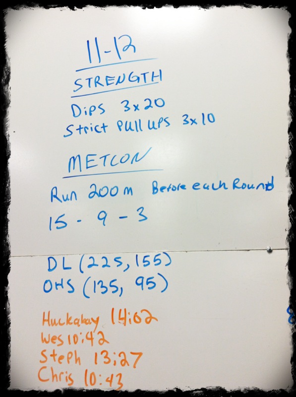 MetCon: 15-9-3 of Deadlift (225,155#) OHS (135,95#), 200m run before each round