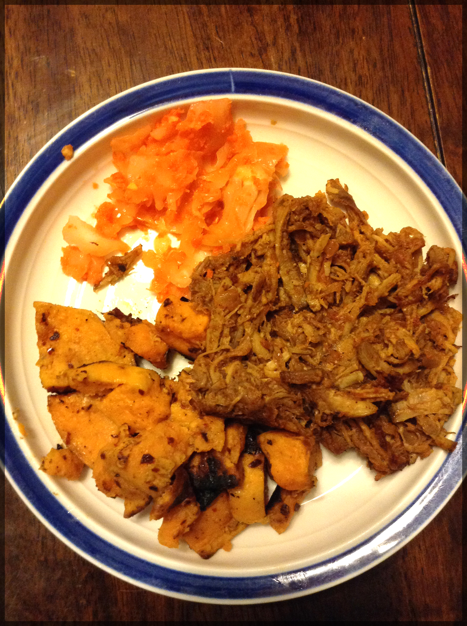 Dinner was already premade thanks to Weeknight Paleo by Amber Beam. I made her Slow-Cooker Pulled Pork with Stellar Sweet Potato Home Fries on Sunday and all I had to do is a little reheat and I was done. Granted Sweet Potato Home Fries are much better right out of the oven, but they are still tasty as a leftover. I added some Kim-Chi to my pork and I was set.