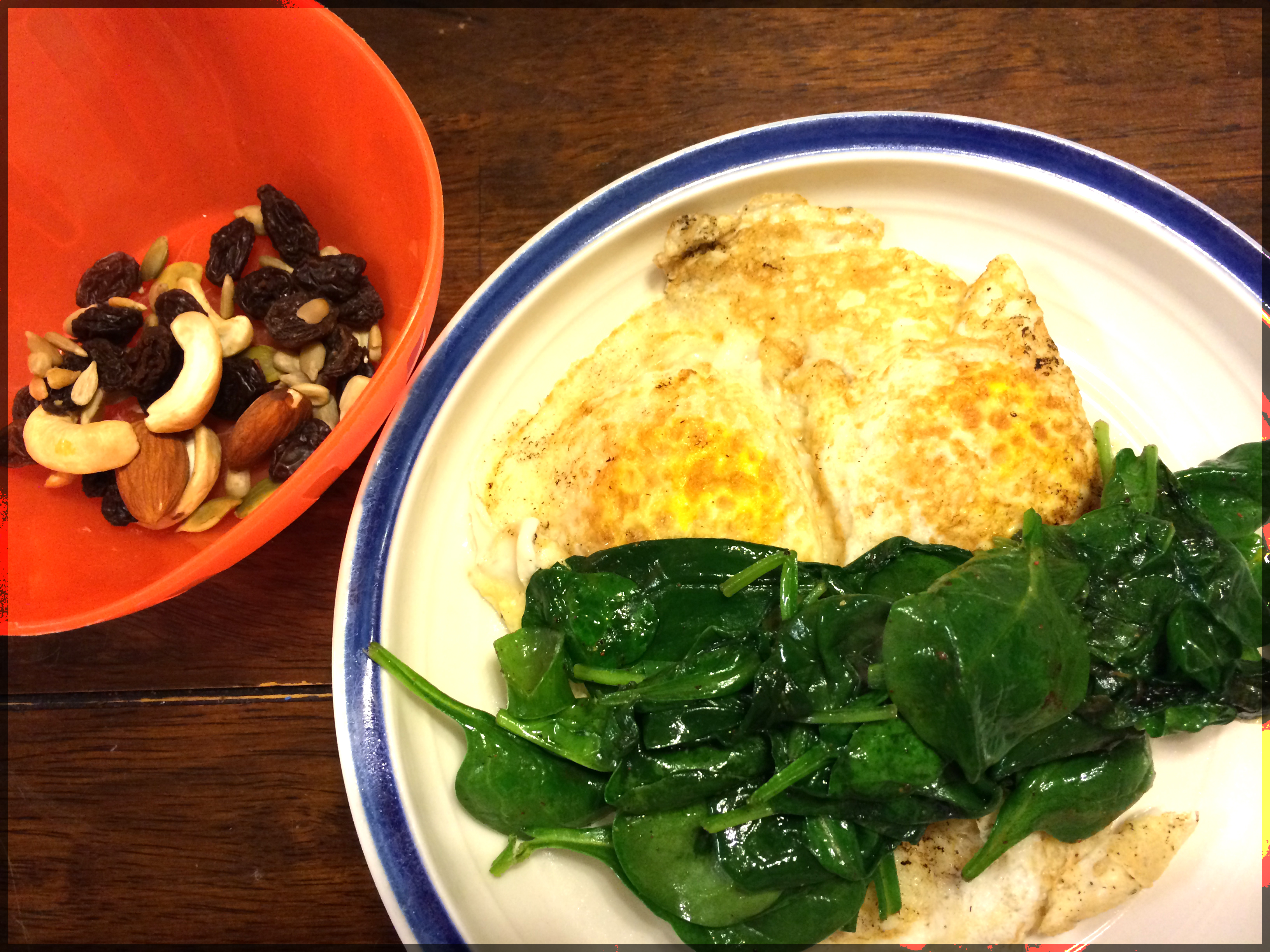 I wasn’t really hungry and I’m really not much of an early breakfast kind of girl but I have to plug away and do this right. I made two eggs over medium using Avocado Oil (delicious). After those were done, I plated them, then threw in 2 cups spinach to same pan with a little more oil added along with some green onions (precut on sunday). Had a small handful of raw trail mix and breakfast is down for the count!