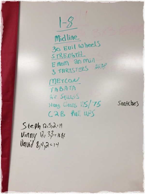 So I rolled in a few minutes late to the BOOM Box…. you can’t fault me for that when I’m showing up at 5 a.m.! Coach T already has his wheels turning on what I would be substituting for the WOD. Cause it was Thrusters and Hang Cleans on the board.