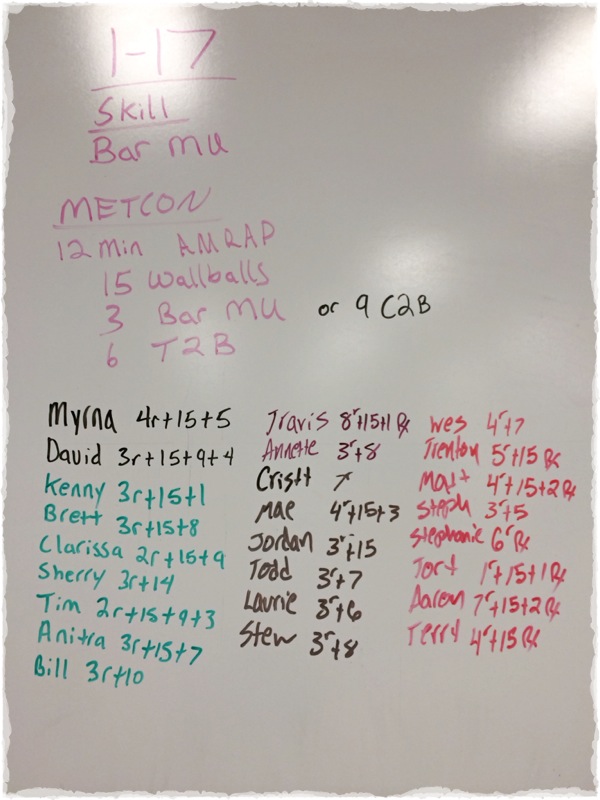 MetCon: 12 min AMRAP of 15 Wall Balls, 3 Bar MU, 6 T2B