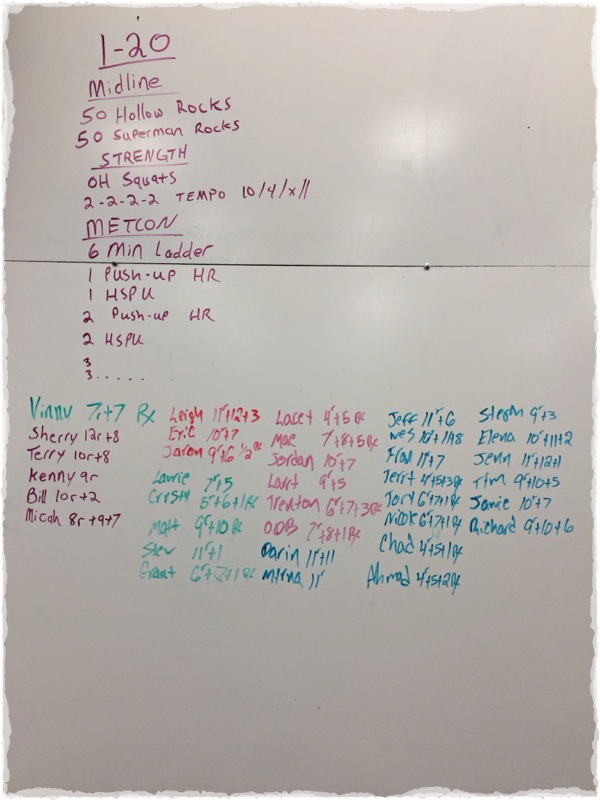 MetCon: 6 min Ladder of 1 Push-up HR, 1 HSPU, 2 Push-ups HR 2 HSPU …. The mod for HSPU is box step overs. get as high as possible!