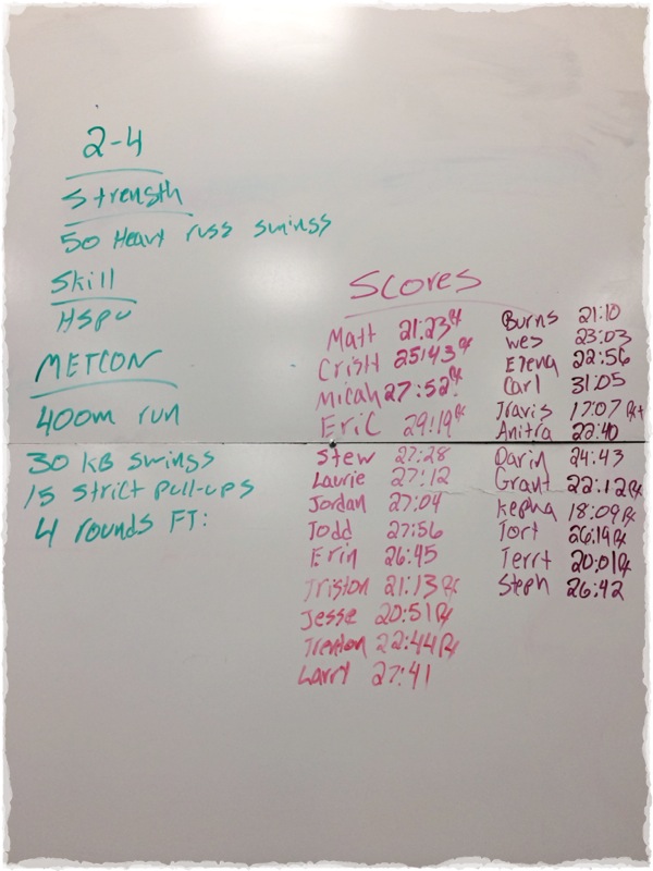 MetCon: 4 rounds of 400m Run, 30 KB Swings, 15 Strict Pull Ups