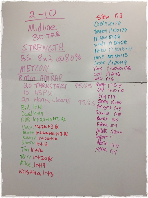 MetCon: 8 min AMRAP of 20 Thrusters 95/65, 10 HSPU, 20 Hang cleans 95/65