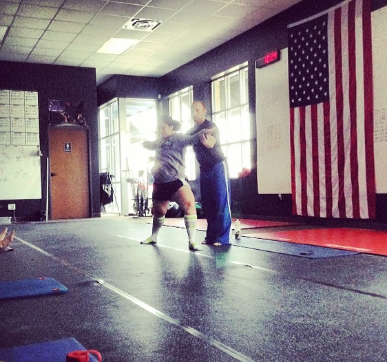 And this is where the modifications came in. 20 Push Ups instead of 10 HSPU. I can only do Thrusters with the bar right now and I can clean more weight than with proper technique. I can only do the chicken wing clean. So Coach asked if I could do 55lbs and I said I’ll try. Well that was dumb. I forgot in a split second I can’t properly clean the bar. So that hurted. So he decided to have me do STOH with the weight already racked. I said sure! 3, 2, 1 GO. I went to get the bar and go overhead and I couldn’t do it. The damage had been done and my wrist was not happy. So I looked at Coach while everyone was gettin after it, like I can’t do it. So I went to Push Ups while he figured out a modification for me. I did KB Swings in lieu of Hang Cleans and I did a Thruster mod with dumbbells. Final: 3 rounds + 20 Push Ups