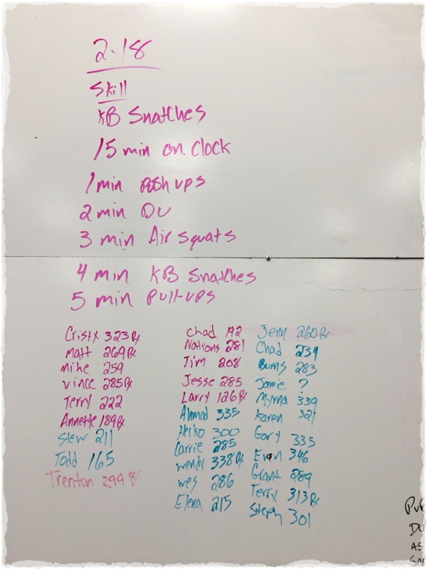 MetCon: 1 minute of Push Ups, 2 minutes of Double Unders, 3 minutes Air Squats, 4 KB Snatches and 5 minutes of Pull Ups