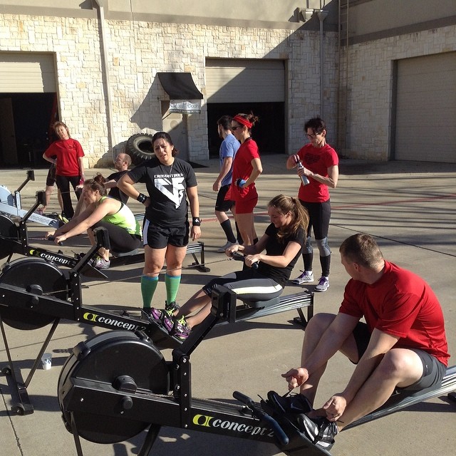 You just never know what Coach is going to throw at us for a Community WOD but most of the time it’s teamwork and this day was no different. It was forecasted to be an AWESOME day but it was still a little chill at 9am. But once you get sweating it was perfect. We went outside for some ROWING and some YOKE/SLED PUSHING.