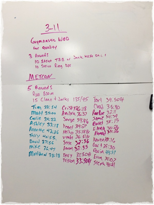 MetCon: 5 rounds Run 800 meters 15 Clean and Jerks 135/95