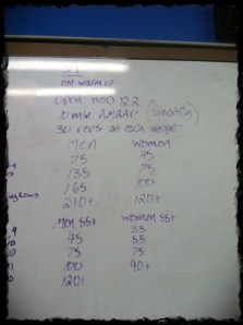 Well I know I can do 75lbs from one of 2013 workouts where we had a similar WOD. But they were sloppy and ugly. With my wrist being such a bugger lately, I wasn’t sure how far along I would get.