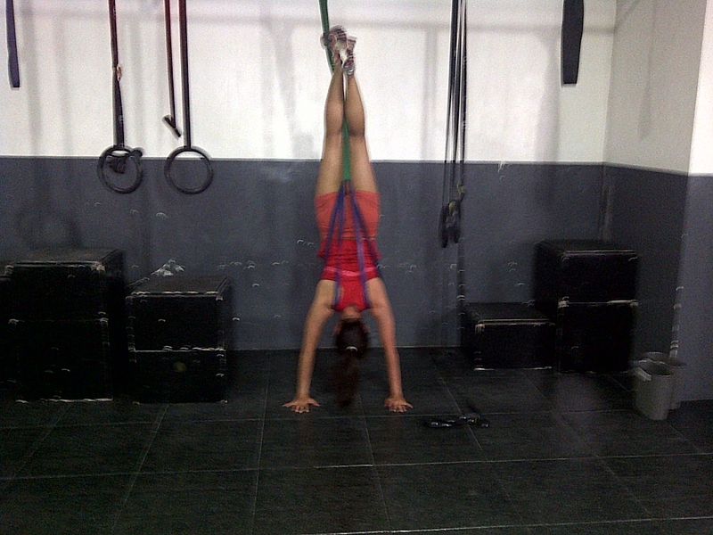 NO MetCon today, SAY WHAT? Yup we worked on Gymnastics Skills. We were going to Bar Work along with working on Handstand Push Ups but ended up only working on HSPUs. Instead of our normal set up with putting a 25lb or 35lb bumper plate under and abmat we went for a BAND Contraption to hold us up so we could practice full depth. I think saying full depth for a HSPU is correct but if it’s not I hope you understand what I mean. If we have a plate under our abmat our range of motion is limited which is still helpful but today Coach set us up in something along the lines of the images below. It was definitely ODD at first but it made sense and I felt like I worked at it a little better.