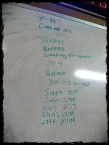 For me it was Ring Push Ups and Dumbbell Clean & Jerks (25lb dumbbells). I never felt right doing the Ring Push Ups but my triceps and shoulders were on fire, so something was working. And for the Clean & Jerks, as I got through, they seemed to get easier. Just working overhead in general is a work in progress. But I’m glad I’m working my back. Final: 6 rounds + 5 Ring Push Ups