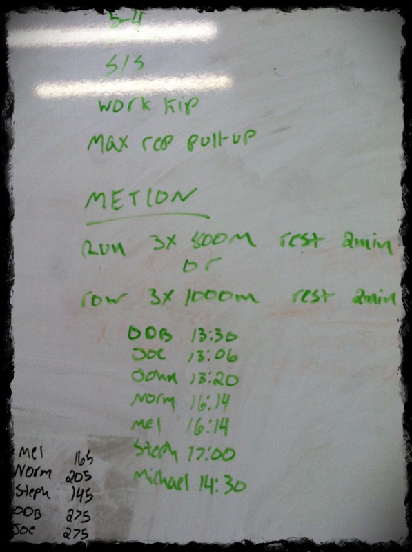 Our MetCon was all running today. Nice to have a break but I DON’T LIKE THE RUNNING! Today just wasn’t fun for me! I’m sure you’re wondering what it is I do like because it seems as if I don’t like anything! Hehehe. But I still do it because I do feel good afterwords, sometimes, mostly, you get the point! Back to running! It consisted of 3 rounds of 800m run with a 2 minute rest in between. My first run was 3:56. WOOO ME. I typically run a little over 4 minutes. My next run was 4 minutes 3 seconds. Still not too bad. Our goal was to keep consistent. So far so good. Got my 2 minutes rest but my 3rd run ended up in some walking. I got one of those horrid side stitches. I tried running through the pain but it just got worse. And deep breaths made it worse. I had to stop. My last run was more than 5 minutes 😦 … Total time 17 minutes. It hurt I didn’t care at that moment but I really wish I could have tested my limits on that last run.