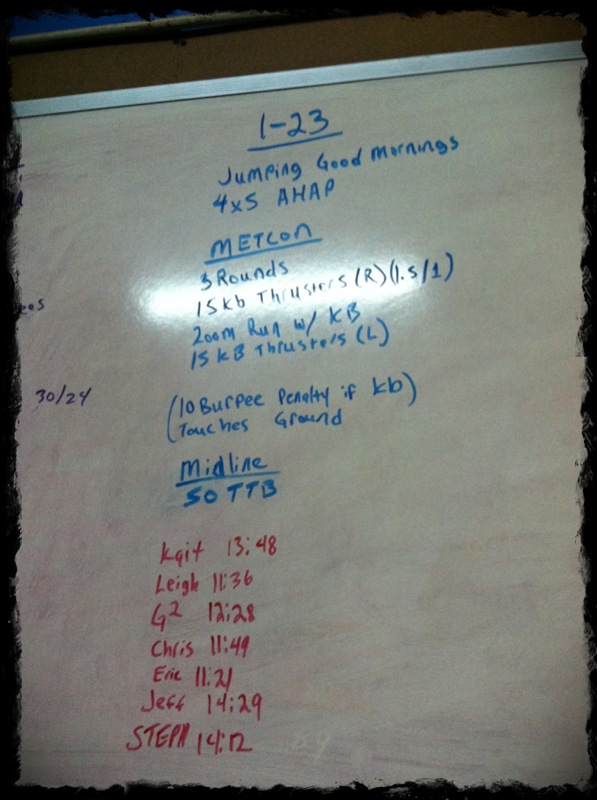 We then had to do 21, 15, 9 of Step Ups and KB Thrusters with a RUN between the sets. So I warmed up with a 1/2 POOD KB (17lbs or so) and I could manage that. Those got taken up quicklike by other teams so I gave 1 POOD a go. Well I could complete the movement with my right arm and the left arm was weak! But that’s what we stuck with. After many FAILS I was downgraded to a 20lb dumbbell. RELIEF! It was now only the running that was miserable. When we came back for the sets of 15 I saw I now had a 25lb dumbbell…. sneaky sneaky Coach! That was still better than the 35lb KB! Poor Russell, I apologized about 7978798 times for being slow at the runs and for sucking in GENERAL. We came in last, I didn’t even look at the time. It was sad.