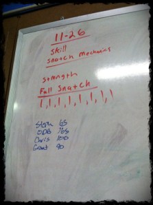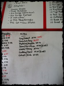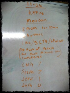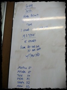 We did some bar torture and some PVC work with Overhead Squat Mechanics. We then worked on kipping. I am tight. My upper back, shoulders and whatever else that can be tight is TIGHT! It is no fun. On the bright side of everything hurting I forget my hands hurt so I felt a little stronger when it comes to kipping. I feel a little more coordinated and hopefully I’ll get some form of a pull up SOON.