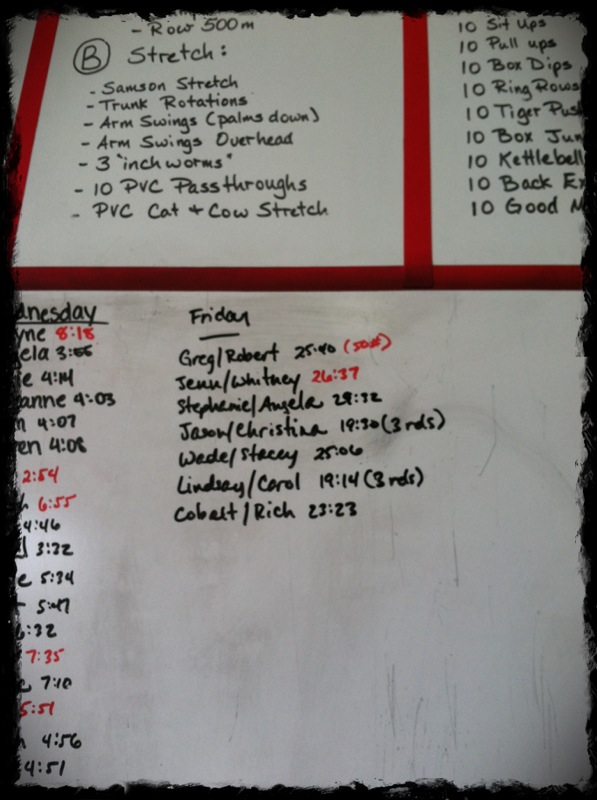 Running! Booooo! I started off on a slow but steady pace. My right shin is still pretty beat up so I felt that for a while with every step I took. but 2/3 of the way back my left calf and shin decided to speak up and well they were LOUD. My jog became a slow trot. It was horrible. Again another poor run performance. Something in the 11 minute mark. Everyone had been back and busting through those Cleans! I didn’t do the 75lbs, because I’m a wuss and thought I wouldn’t be able to do 50. Turns out I probably should have/could have. I caught up pretty quickly after being so behind on the run. I still don’t execute HSPU very well without being modified so I did them off the box. And that turned out to be surprisingly easy. I’m somewhere in the middle, I suppose. Which is great! HSPUs here I come! Time: 16:34