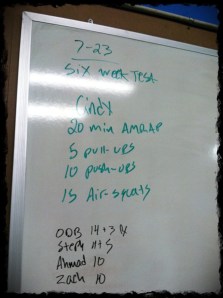 After the workouts on Saturday I did nothing but sleep and eat poorly. This added to the week worth of vacation POOR eating, I knew I was in for it Monday Morning! And I was really in for it because it was 6 week test of CINDY! Six weeks ago I posted about weaksauce Cindy and that was after one weekend of bad eating, what will 9 days of bad eating get me?!?