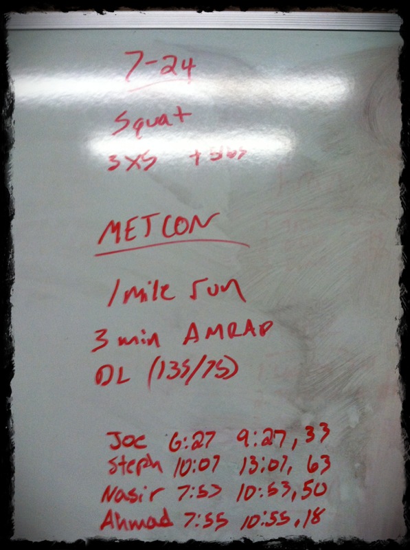 MetCon: One Mile Run, then 3 minute AMRAP of Dead Lifts at 75lbs. So ya running, bleh! Slowest mile I’ve run in a very long time. 10:07! WTH. The guys are way faster and I was just left to my own devices of going SLOW! I didn’t even realize how slow my pace was until I got back inside. I had no time to cry about just do Dead Lifts. 75lbs isn’t so heavy so I knew I could get a good chunk in. I did 22 unbroken then broke down to sets of 10. All this poor eating has left me winded. I can’t breath. And I want to cry! In the end I completed 63 Dead Lifts. Here’s hoping that the rest of the whiteboard doesn’t blow me away. Well I know the run sucked but hopefully I made up for it in DLs!