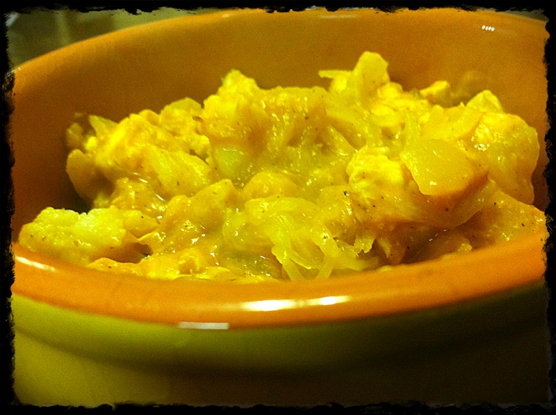 Once your squash and cauliflower is done cooking, and chicken saucey mixture is heated up, de-thread spaghetti squash with a fork, running the fork the opposite way of the threads.