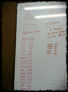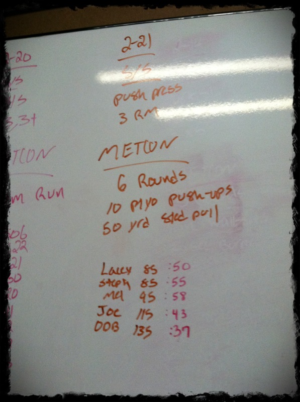 My legs were in some crazy soreness after Mondays insanity. Oh Jumping Air Squats how you hurt me. And to greet my sore jello-y legs were Sled Pulls! These are right under Wall Balls in my dislike column.