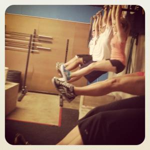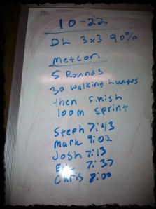 If that doesn’t make sense this will. We had 3 minutes to run 400m then bust out as many Double Unders as possible with remaining time. Then rest 1 minute before going on to round 2 and 3. Well, well, well. This girl sucks at running but I thought I can sprint this out right? So I took off! and that lasted 20 seconds if that. And I had to shift back down to a non sprint mode. Made it back in 2:00. That’s a whole minute for DUs but my legs were super tired and didn’t want to work properly. I think I got 40 DUs that first round. After the minute rest I figured I’ll start off like I did in round 1 but that turned out to hurt me. Something pulled in my inner thigh and I was not moving fast at all. It wasn’t the kind of pain that brings you crying to the ground but it’s uncomfortable and hurts with every step now. It however did not hurt when doing DUs. Needless to say I came back much slower with only 40 seconds to get some DUs in. I got somewhere into the 20s but nothing allstar. For the 3rd run, I could definitely feel this pulled whatever and took it slow from start to finish. I still came back with 30 seconds left on the clock and was able to string together more DUs than I did in round 2. I finished with a score of 96. Now lets hope this leg thing doesn’t hinder the rest of my week!